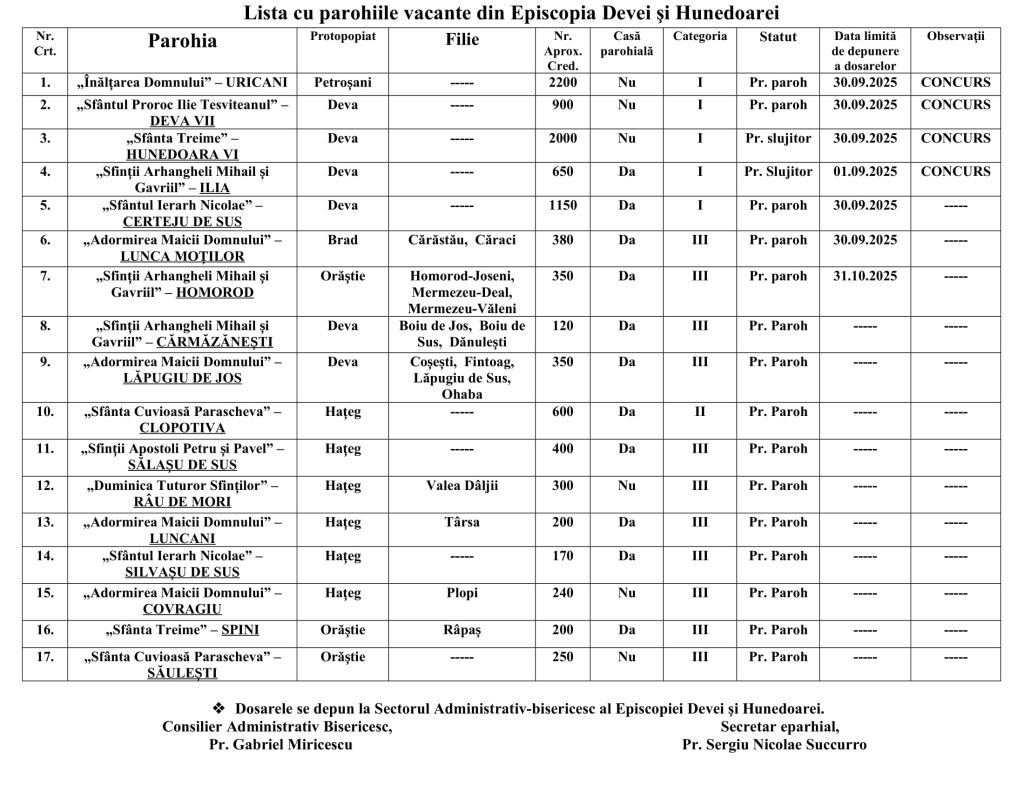 Lista cu parohiile vacante din Episcopia Devei și Hunedoarei