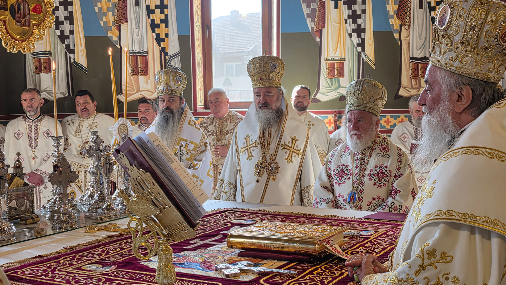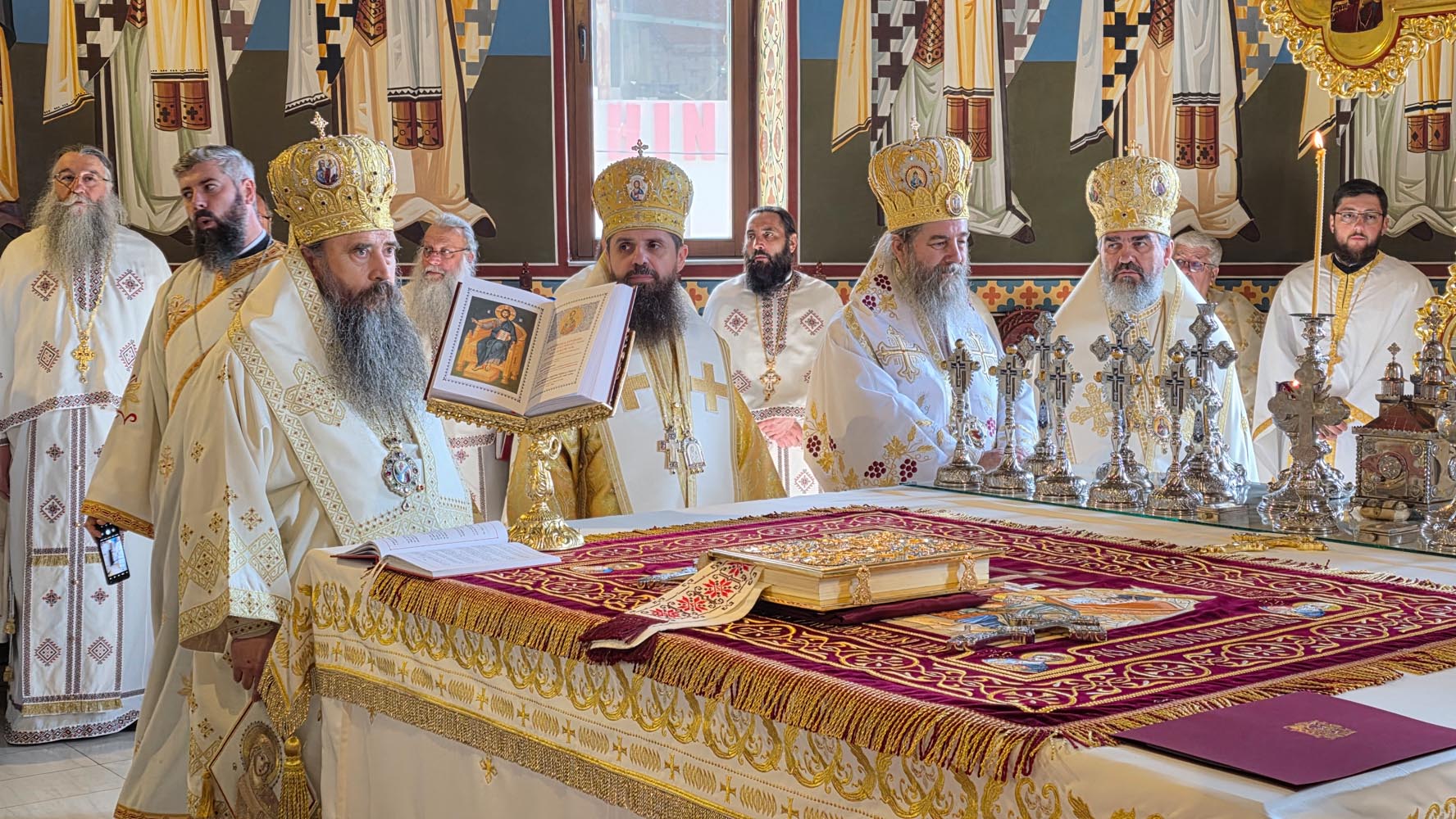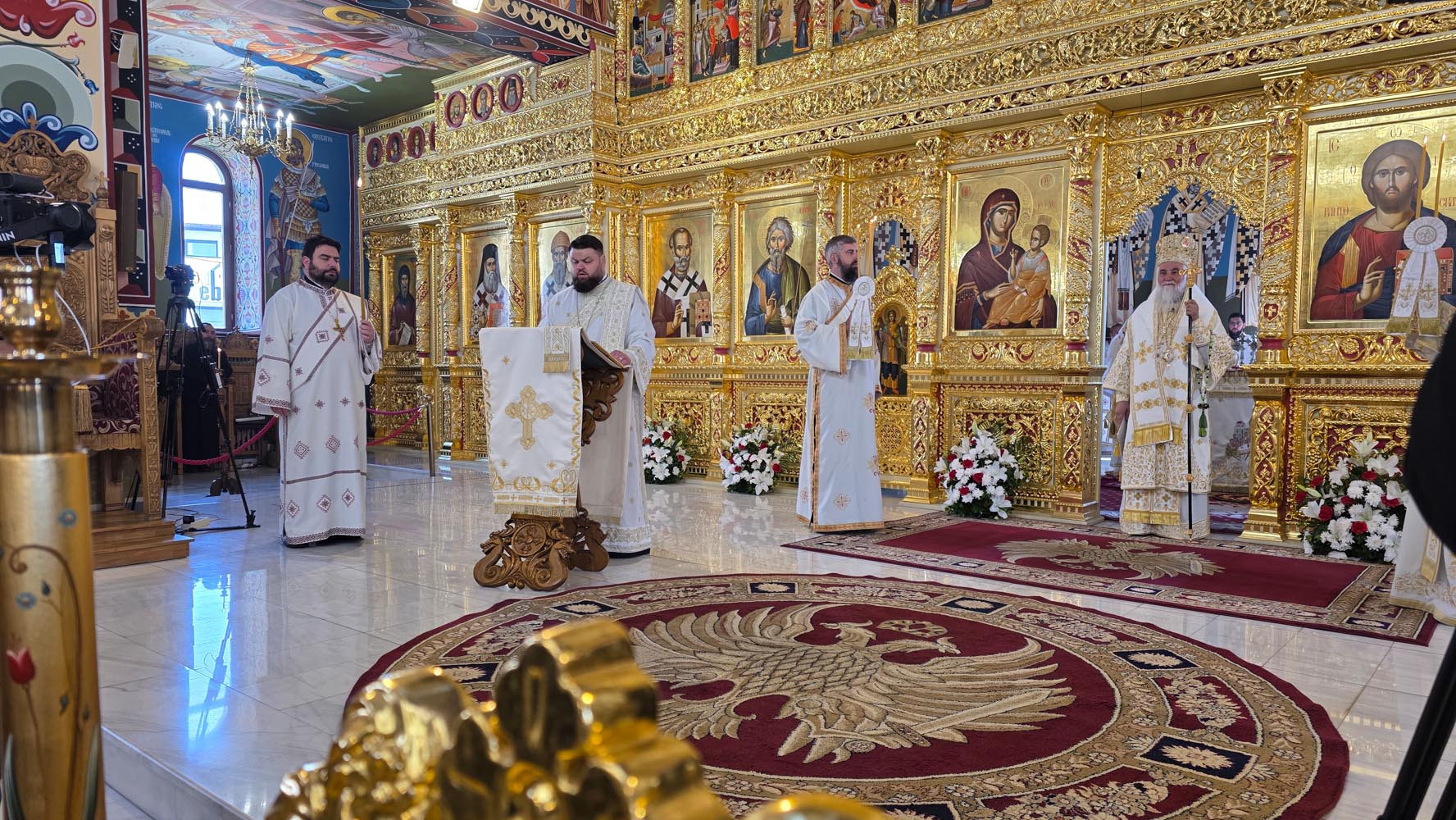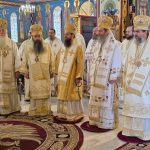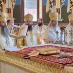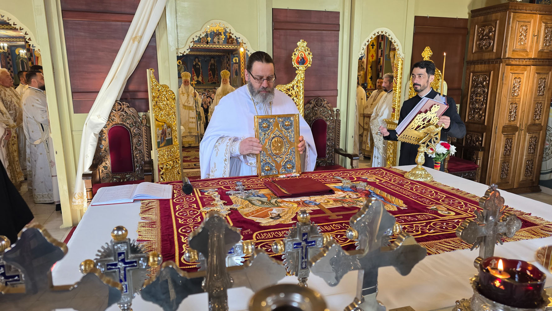 Sfânta și Dumnezeiasca Liturghie, începută la ora 9.30, a fost săvârșită de un impresionant sobor de ierarhi, sub protia Înaltpreasfințitului Părinte Irineu, Arhiepiscopul Craiovei și Mitropolitul Olteniei. În jurul Sfintei Mese s-au aflat 11 arhierei, alături de numeroși preoți și diaconi, veniți din diferite colțuri ale țării și de peste hotare, sporind solemnitatea acestui moment de har.